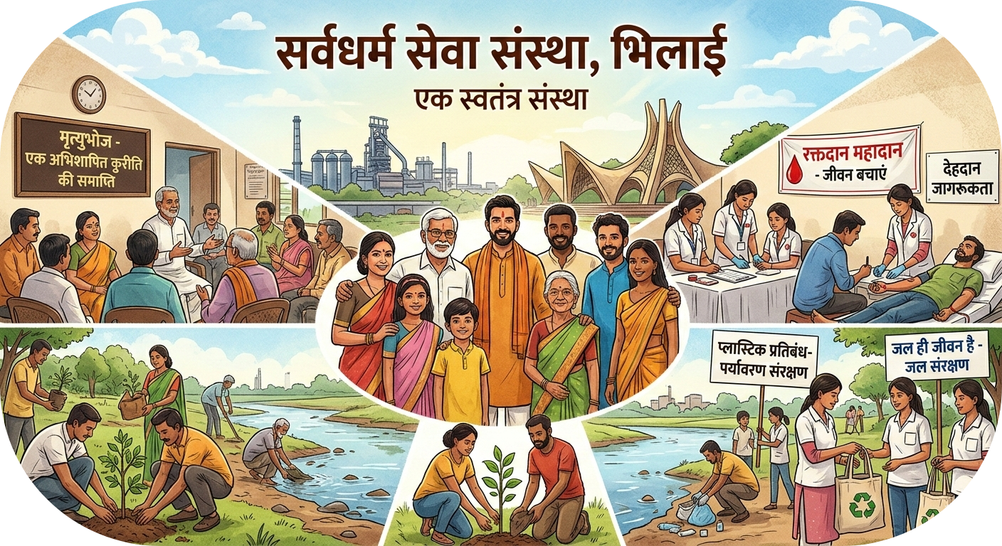 Sarvdharm Sewa Sanstha, Bhilai is an independent organization whose sole objective is social service and public welfare. Under this, various initiatives are being carried out by our organization. The major focus includes eliminating harmful social practices like death feasts, encouraging people to participate in humanitarian activities such as body donation and blood donation, promoting social harmony and brotherhood by reducing mutual conflicts, and spreading awareness about environmental protection by advocating ideas like plastic ban and water conservation among the general public.